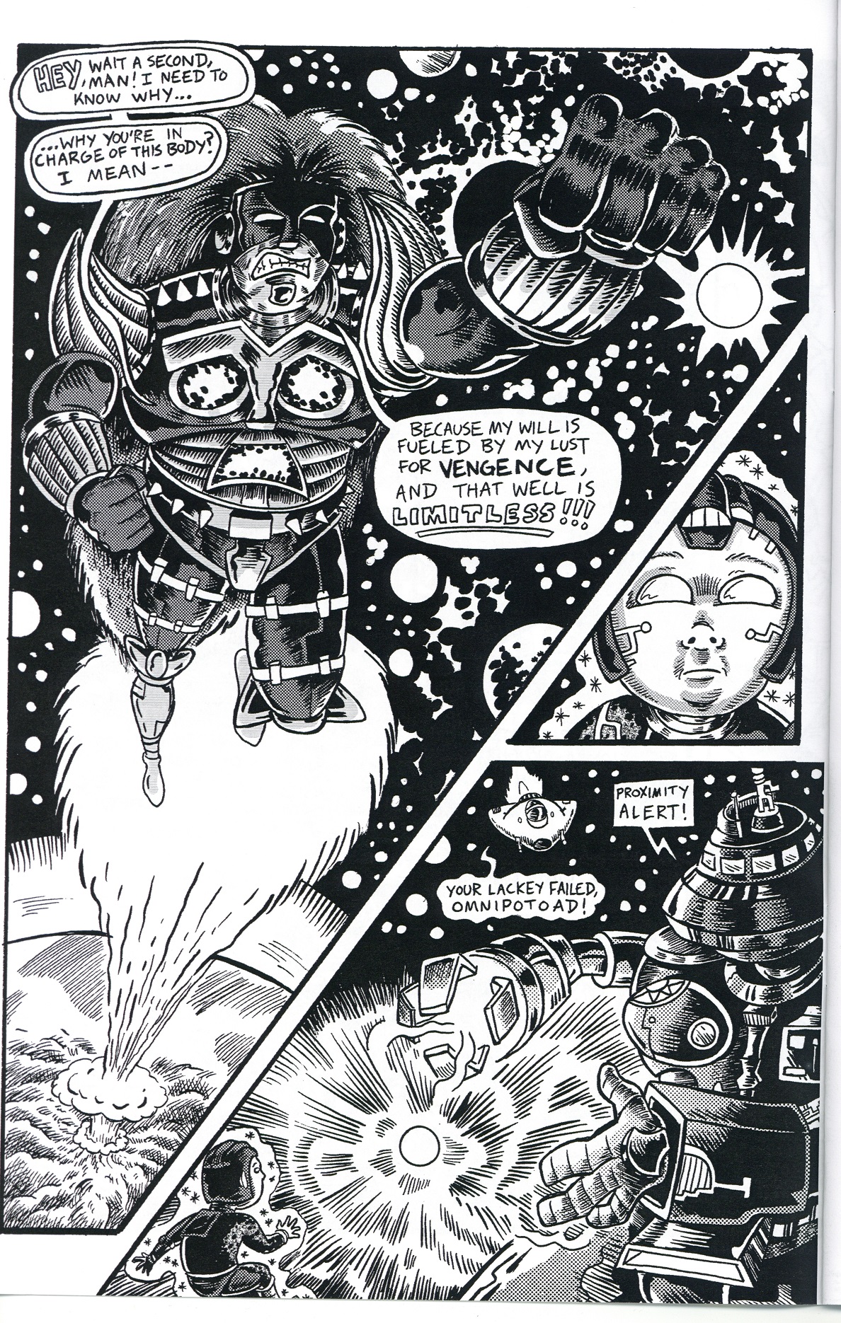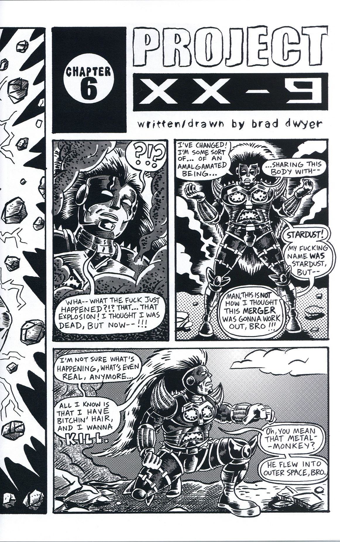 APE-MEN OF THE APOCALYPSE is an epic sci-fi, action-adventure series, drawn in the tradition of comics produced during the 1980’s B&W indie explosion, with a nod to the irreverent humor of the Underground Comix of the ‘60s. POWER NELSON and a cadre of public domain heroes wage war against a genocidal horde of Ape-Men, robots, and mutants in a battle spanning across alien worlds, alternate dimensions, and time itself.