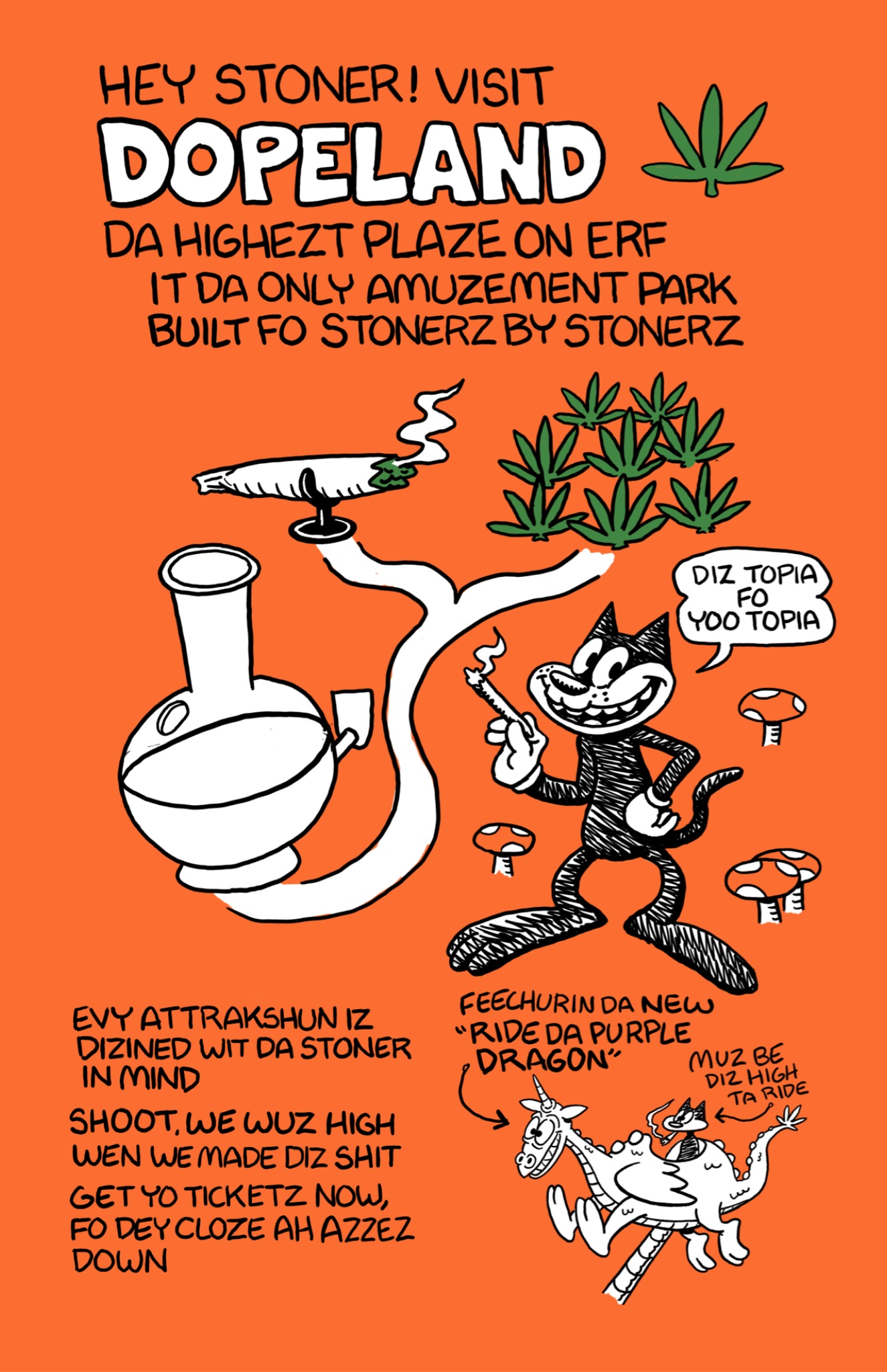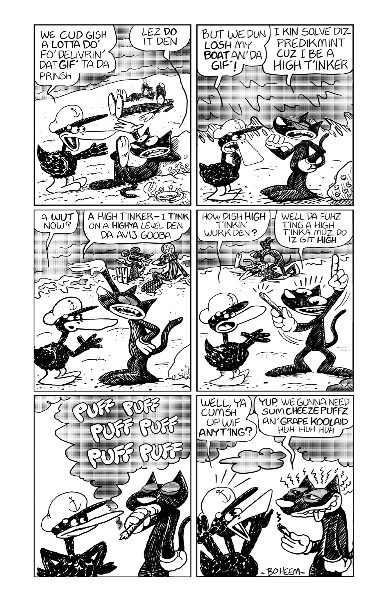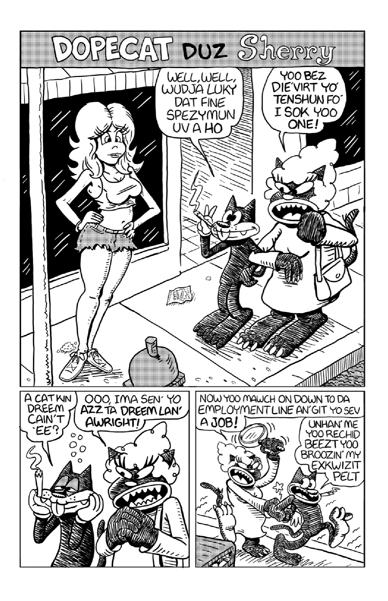 The fifth issue of the continuing series starring Dopecat, a stoner cat who gets his kicks smoking blunts and chasing hos. Join Dopecat as he visits Dopeland, the dopest place on Earth! Then jump on board a stolen pirate ship, butt heads with a man-eating whale and get lost in a forbidding forest of savage beasts. And remember , when you purchase an issue of Dopecat Comics, you’re helping us end illiteracy one stoner at at a time.