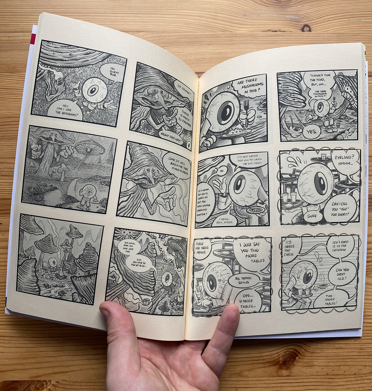 Eyeland is an adventure strip that follows “Eyeland” the titular character, as they tumble down the rabbit hole. What if underground cartooning mashed up against the Hobbit? Equal parts humor, philosophy, and adventure, follow the eye as they come to grip with the nature of their reality.